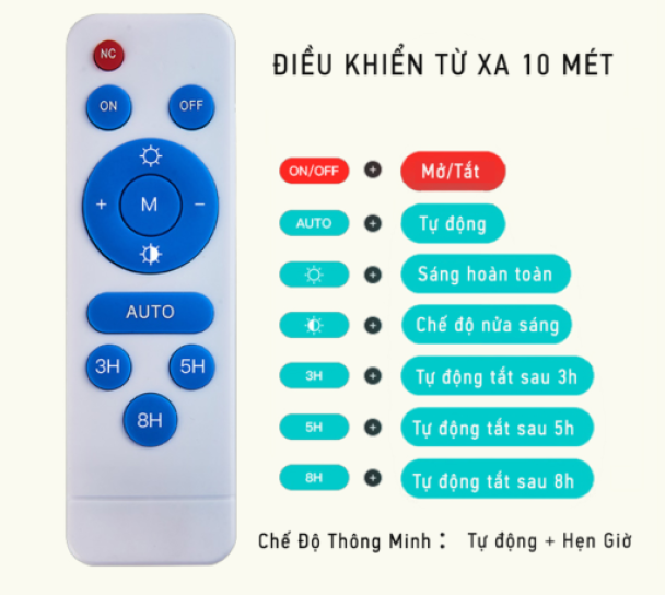 - Chế độ tự động (bấm nút AUTO trên điều khiển): Đèn có cảm biến ánh sáng sẽ tự động bật khi trời tối và tắt khi trời sáng, trong thời gian hoạt động đèn sẽ tự điều chỉnh độ sáng để đáp ứng thời gian chiếu sáng cần thiết.